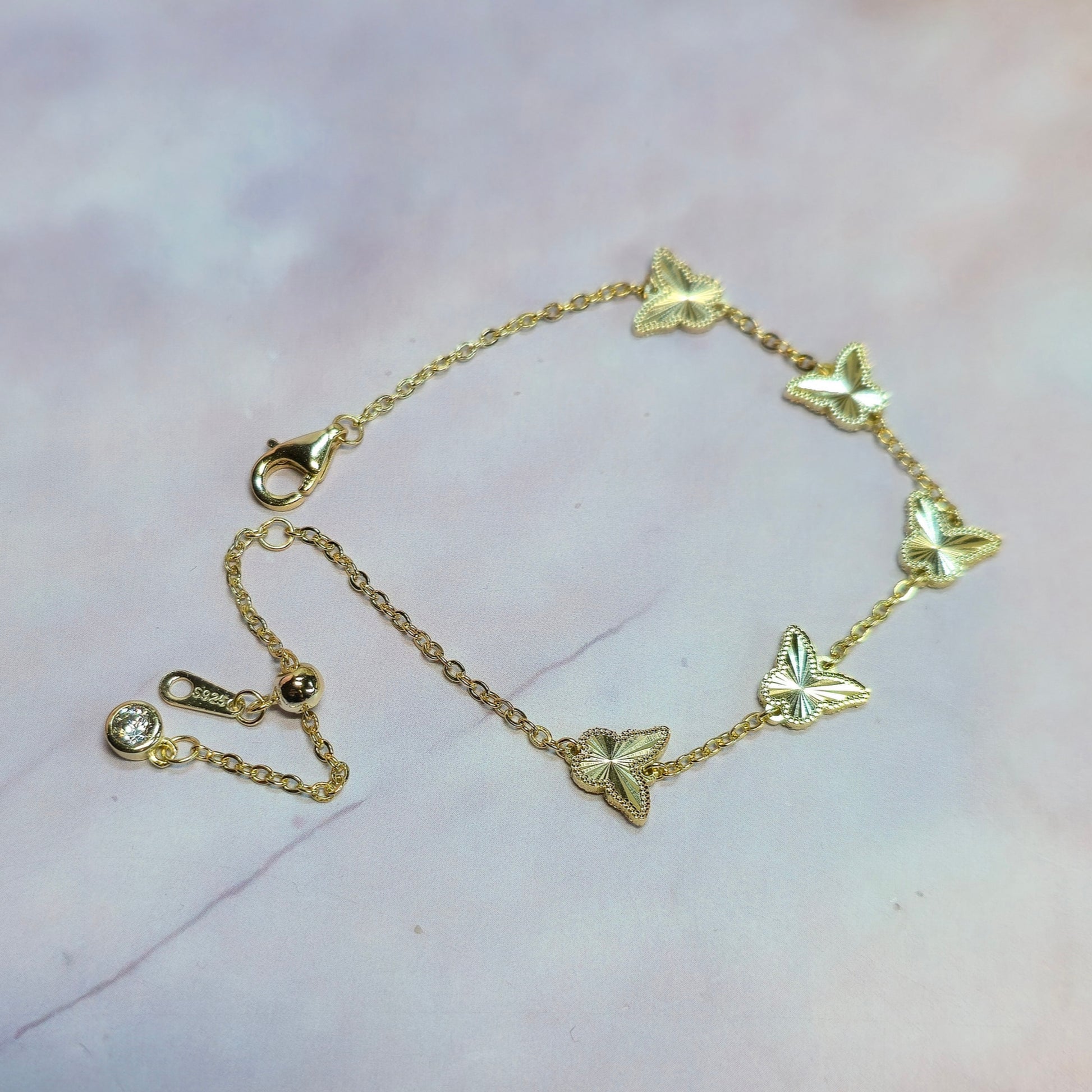 Parametry Bransoletka z motywem motyli wykonana jest ze srebra próby 925 pozłacanego 14-karatowym złotem, o długości 15cm z przedłużką 4cm i przybliżonej wadze 3g. Bransoletka na swojej długości posiada pięć motyli z dwustronnym ozdobnym szlifem o całkowitych wymiarach 7.4mmx8.3mm. Mimo braku cyrkonii, grawerowana powierzchnia pięknie odbija światło, nadając motylom intensywne migotanie. Kruszec: Srebro Próba: 0.925 Platerowanie: 14-karatowym złotem