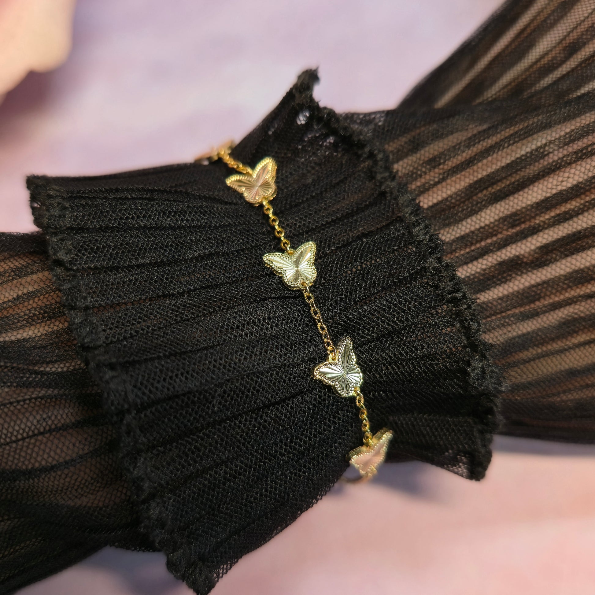 Wymiary motyla: 7.4mmx8.3mm Długość: 15cm+4cm Przybliżona waga bransoletki: 3g |