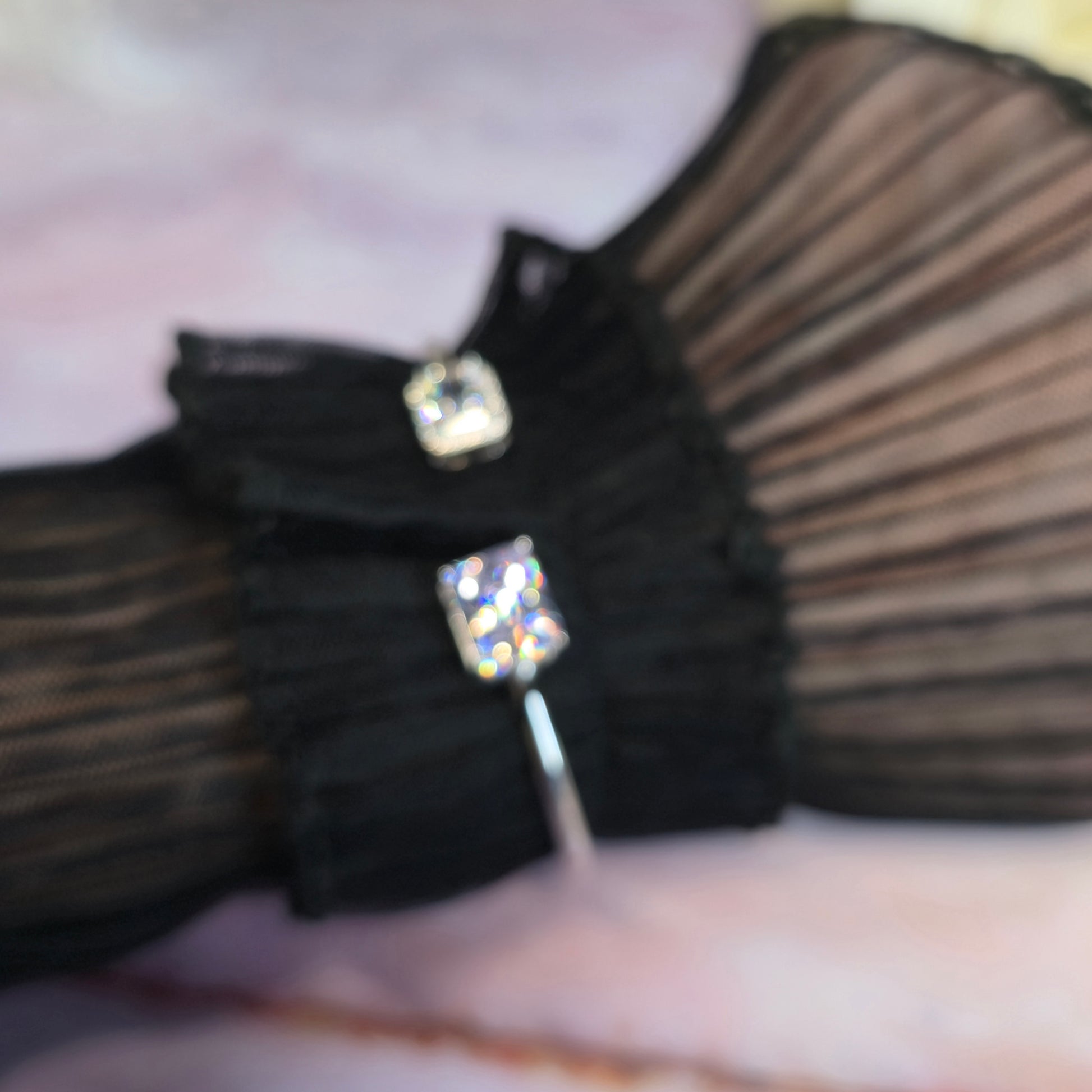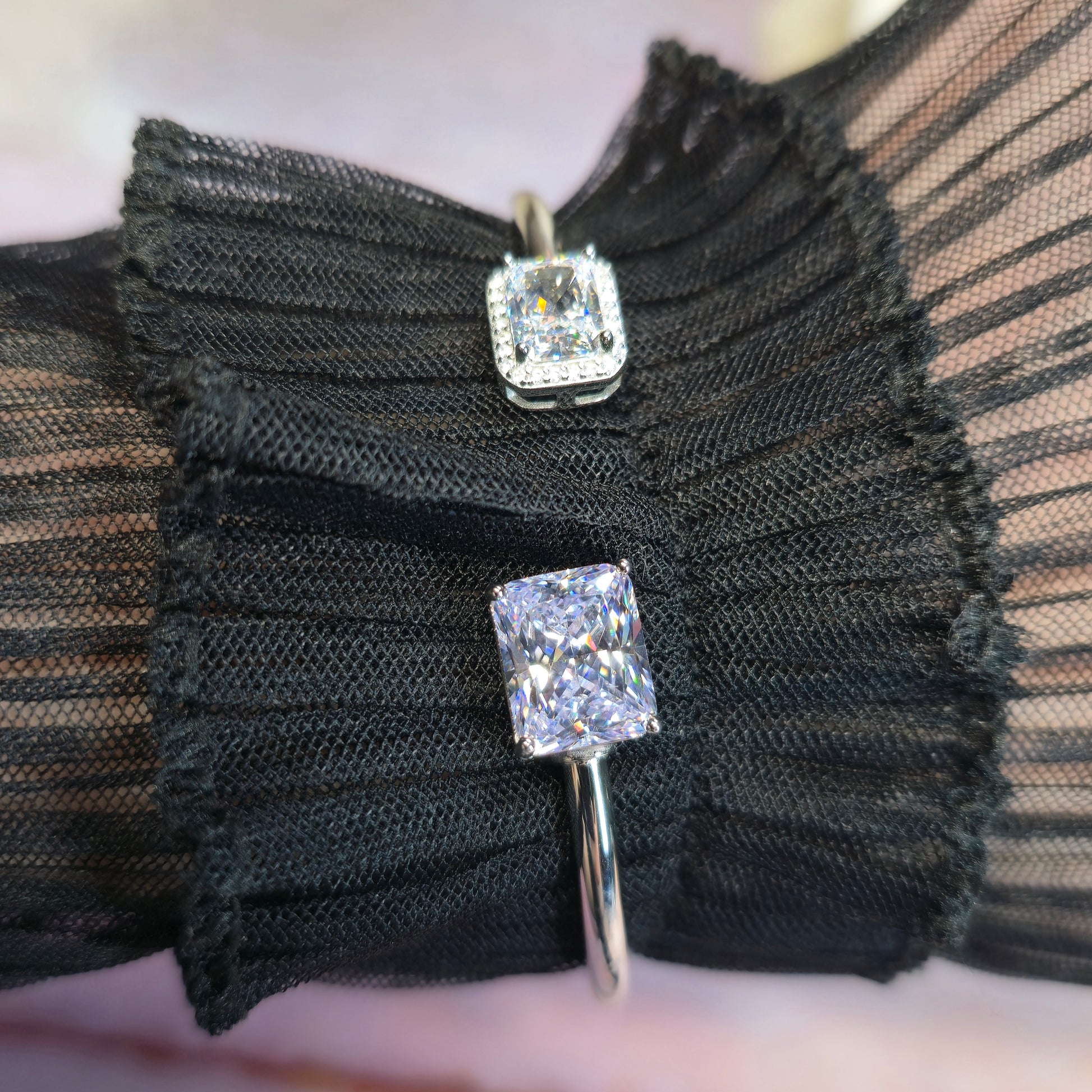 Bransoletka ma otwartą obręcz, a jej dwa końce zdobią imponujące cyrkonie o łącznej wadze 6,75 karata. Jedną z cyrkonii otacza wianek drobniejszych kamieni, które dodają jej jeszcze większego blasku.