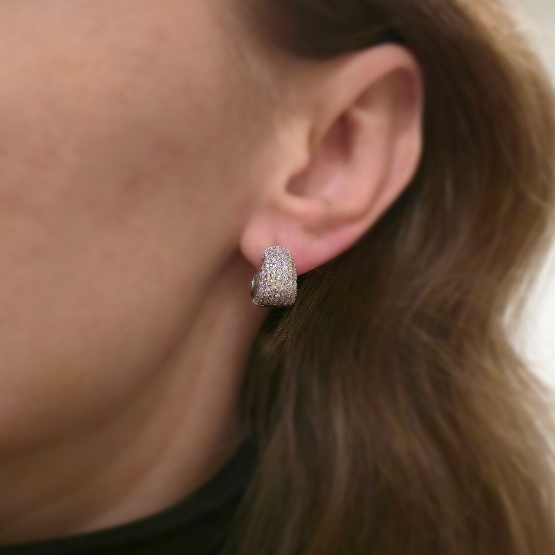 Parametry Kolczyki chunky wykonane ze srebra próby 925 rodowanego, o przybliżonej wadze 5.39 g i wymiarach 13×13.5×9.5mm. Konstrukcja kolczyka rozszerza się ku dole i oparta na sztyfcie wsuwanym w tylną klapkę z niewidocznym zapięciem zatrzaskowym. Przód kolczyków pokryty gęsto osadzonymi bezbarwnymi cyrkoniami klasy AAAAA o okrągłym kształcie i promienistym szlifie, tworzącymi jednolitą, lśniącą powierzchnię. Tył kolczyków pozostaje gładki. |