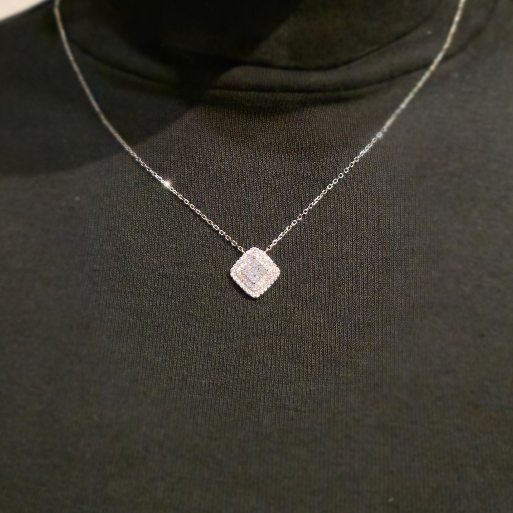 Srebrny naszyjnik z cyrkoniami 'Divine Duchess' niczym skradziony z królewskiej szkatułki, dla kobiet, które pragną czuć się równie wyjątkowo. Zawieszkę naszyjnika zdobi kwadratowa cyrkonia, otoczona dwoma rzędami drobnych, błyszczących cyrkonii.